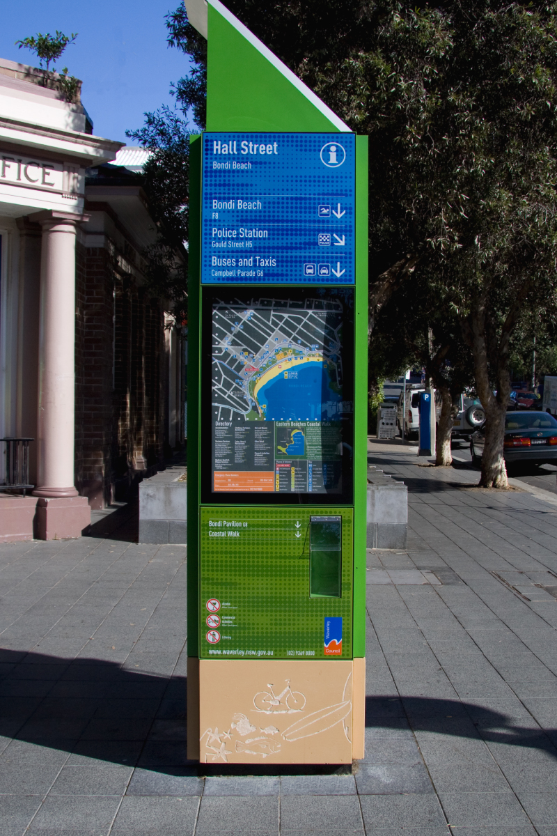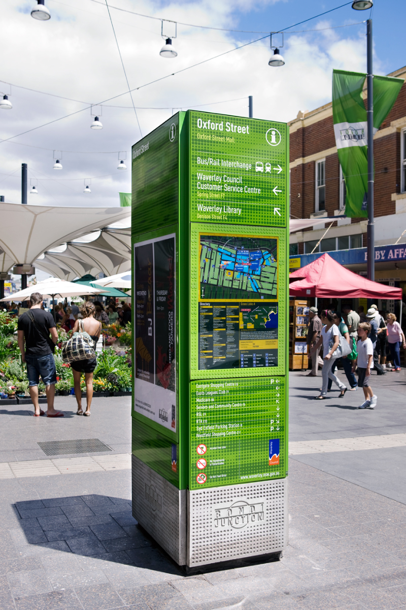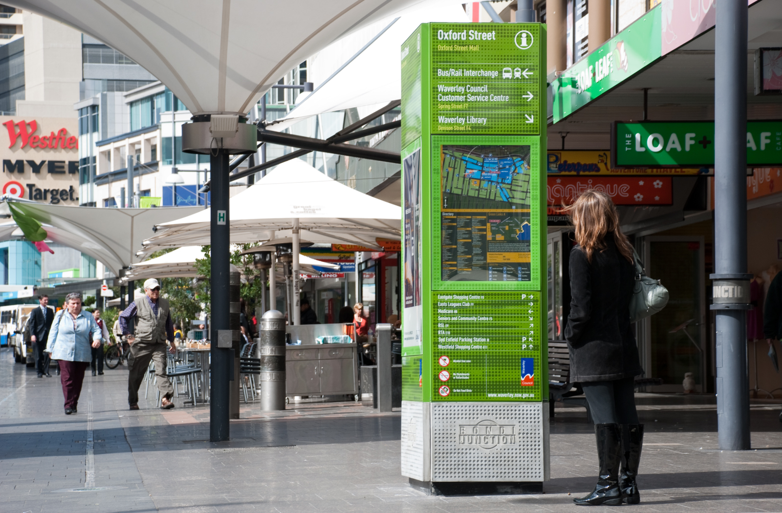 The Bondi Junction wayfinding signage forms part of the greater system designed for Waverley Council. Throughout Bondi Junction the bright green wayfinding signs point locals and visitors in the right direction.