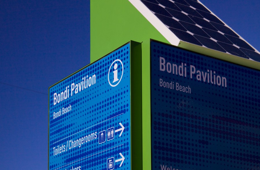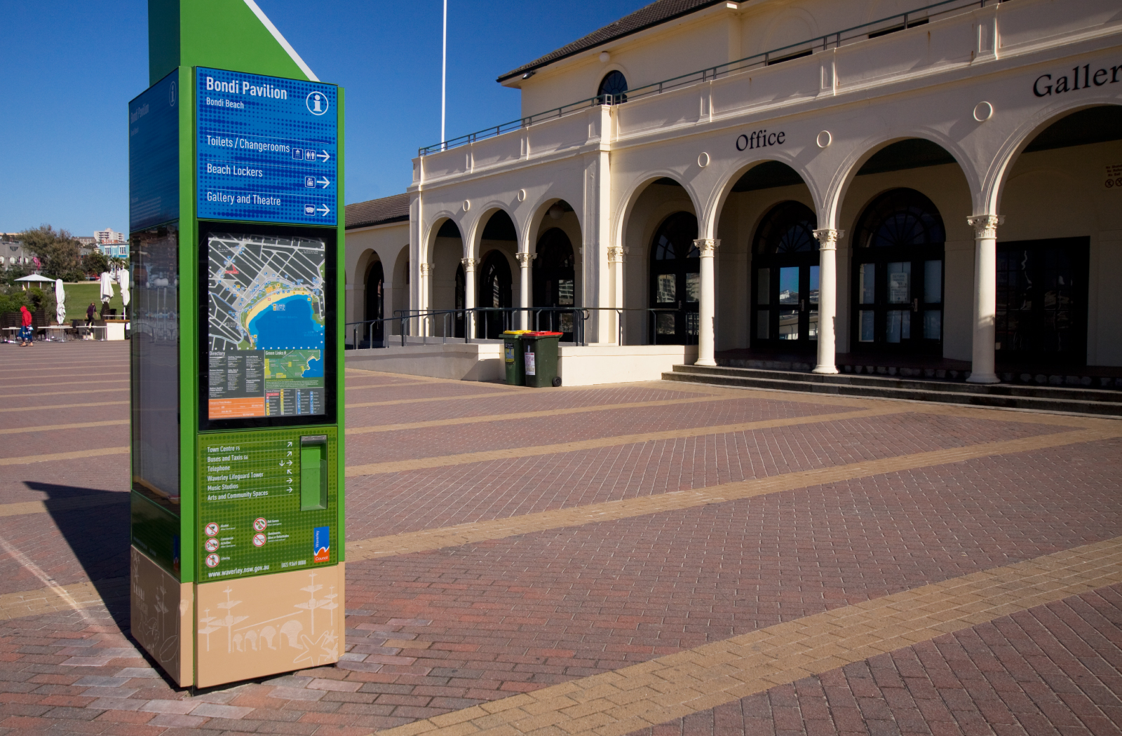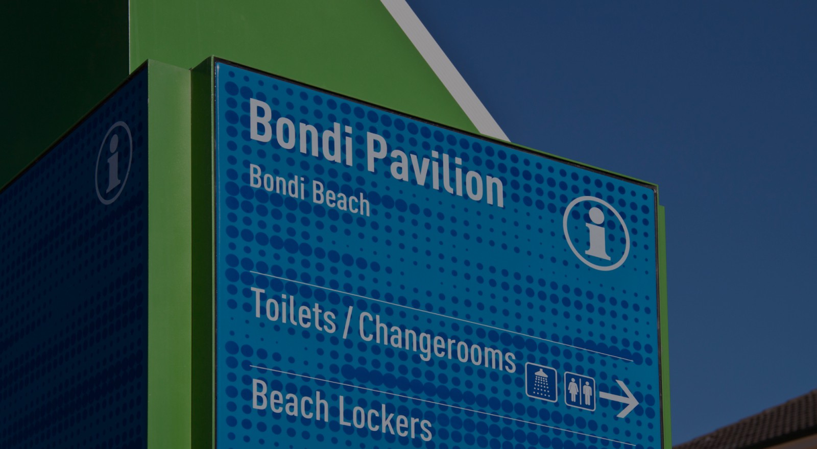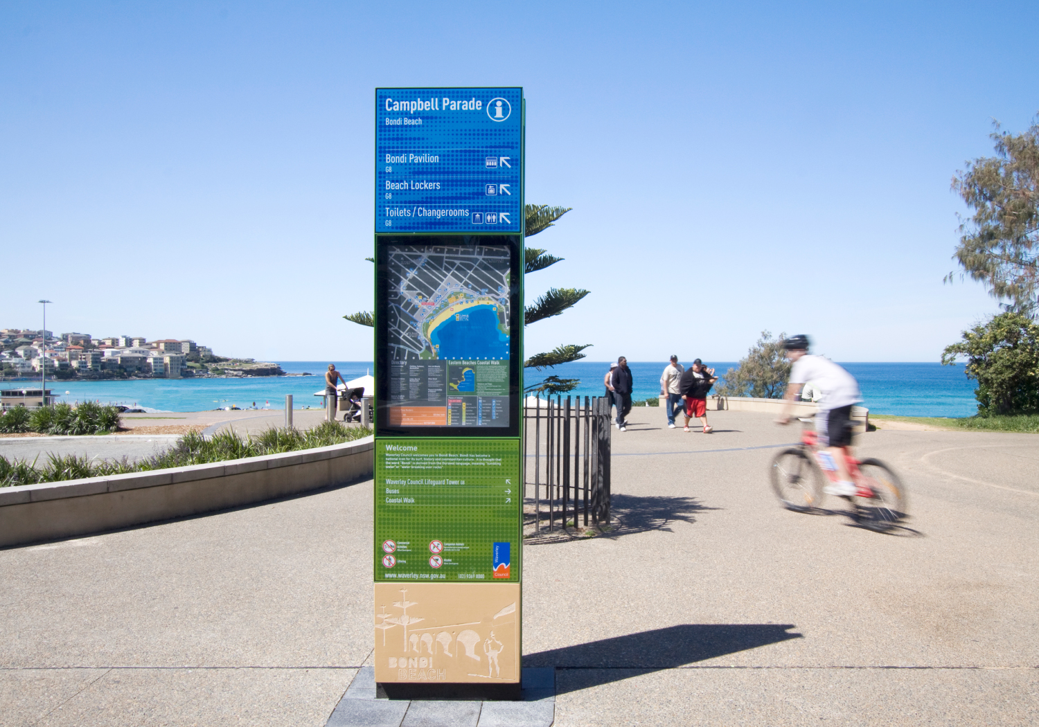 The Bondi Junction wayfinding signage forms part of the greater system designed for Waverley Council. Throughout Bondi Junction the bright green wayfinding signs point locals and visitors in the right direction.