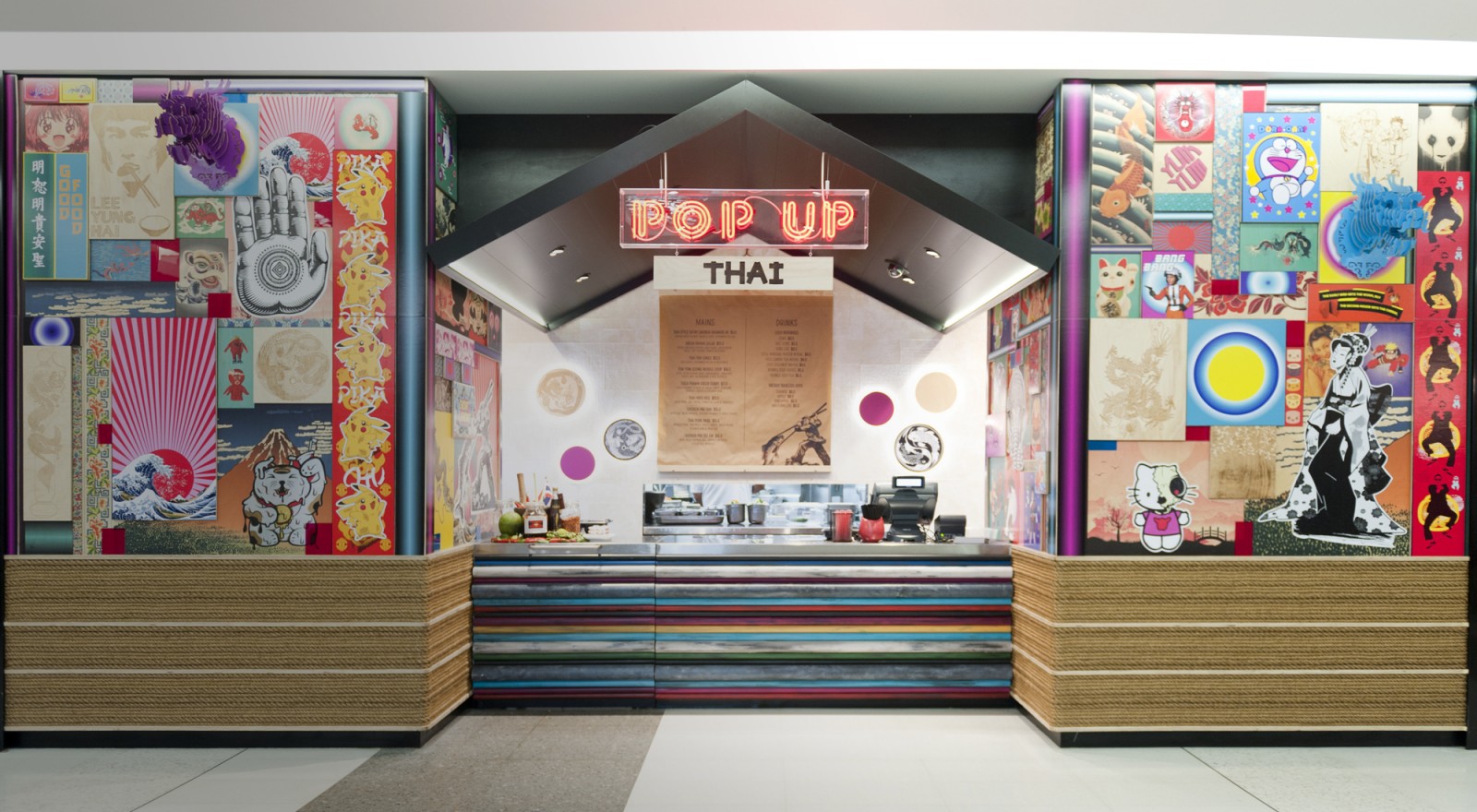 Pop Art meets Pop Thai! In the last few years, pop‐up retail shops, salons, art galleries and bakeries have taken over hotel lobbies, train stations and department stores. The studio applied their creative brushstroke to The Star’s public café court area and created a POP art‐style installation for Asian fast‐food on‐the‐go! With a combination of loud lurid colours, neon, iconic Asian and Japanese cartoon references including Manga, Bruce Lee, Pikachu, dragons and pop Koi the café looks as much art installation as diner.